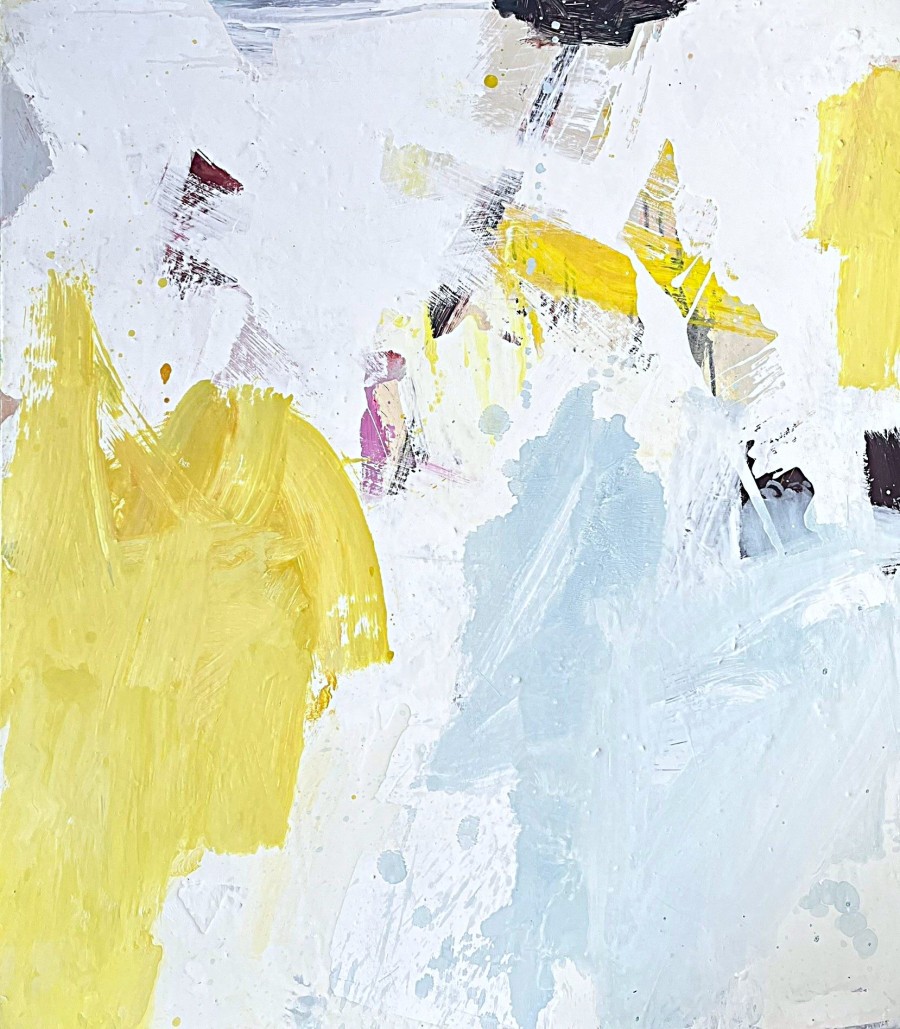 Een schilderij ontstaat zonder vooropgezet plan. Meestal bestaat het uit meerdere bewegingen van streken en lijnen – schrapen, opnieuw lijnen trekken – drogen en weer over bestaande verflagen heen. Een soms eindeloos lijkend proces dat – als het lukt - geleidelijk een associatie met ritme en beweging ontvouwt.